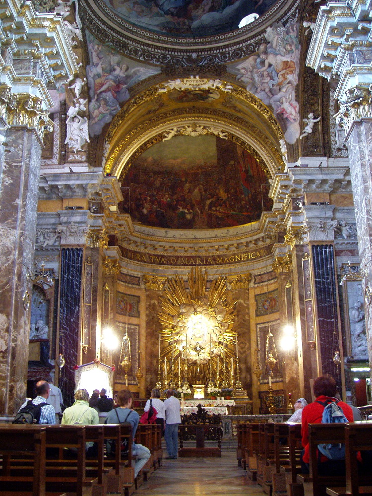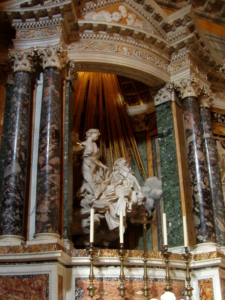先へまた100mほど歩く。 もうひとつ、ベルニーニがやった小さな教会があるのだ。 ●ベルニーニ《サンタ・マリア・デッラ・ヴィトリア》 ロンドンの《ウェストミンスター》で感じたのと同じような、 ガクンと膝にくる衝撃をうけた。 「よりにもよって」ベルニーニの建築でこれほどの衝撃を受けるとは! 自分でも意外だったが、旅はこうでないといけない。 けっして大きくもなく、天井もそれほど高くない条件のなかで、 そこらじゅうに天使が飛び回っている。 やや装飾過多だが、ぼくはこんなバロックの教会を求めていたのかもしれないと思い、 ここにも3回通った。今回のグランドツアーで、忘れがたい建築になった。 ローマ観光で、この教会を外すことはできない。 1回目にいったときは、修学旅行の女の子たちが、 お祈りのポーズで記念撮影してたのが、とても可愛らしかった。 |
