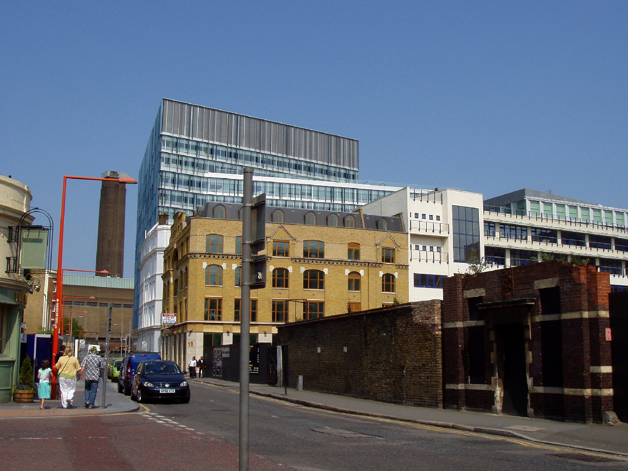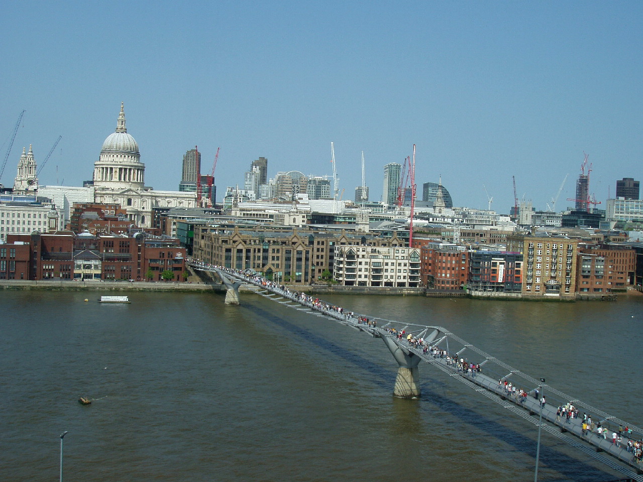 《テート・ギャラリー》のコレクションのうち、近・現代のものをうつすために計画された美術館。 国際コンペでヘルツォーク&ド・ムーロンが勝ち取ったものだが、 第2次選考までは日本の安藤忠雄も残っていた。 しかしヒヤリングの当日阪神淡路大震災が発生し、 関西の作品が心配になった安藤はコンペをけって日本に飛んで帰り、 翌日にはカブを手配し神戸入りした、というレジェンドもある。 それにしても、このプロジェクトの力の入り方は、ここの7Fのカフェから外を眺めて実感できた。 敷地は、テムズ河を挟んで、対岸の英国国教会の総本山セント・ポール寺院と対蹠する。 その2点をフォスター設計の《ミレニアム・ブリッジ》がつなぐ。 今の大聖堂は1666年ロンドン大火後の再建だが、教会はこの敷地に604年からある。 その由緒あるメルクマールと、20世紀の最後にオープンする、英国がこれまでコレクションした美術を収蔵・展示する美術館を、「二千年紀」と名づけられた橋でつなげるわけだから。 さらにいえば、夜ライトアップされるとこの建物は光が十字架形に浮かび上がる。二重に教会にオマージュされるのだ。 展示で一番感動したのは、ミニマリル・アートのエリアだ。 無意識のうちにカメラをかまえて、係員に注意されたほど。 それにしても、ダン・フレイヴィンからドナルド・ジャットにいたるシークエンスは圧巻である。 とりわけジャッドの部屋。 だれがみてもここだろうという、ほんとうにすばらしい展示室がある。 ヘルツォークのミニマルな空間ともピッタリで、あそこに行くだけでも価値はあるだろう。 ただ、ぼくの足はここにきて限界だった。 さすがにしんどかった。 カフェや前の広場で休んでも回復せず、ミレニアム・ブリッジはよろよろしながら渡ったと思うが、あまり記憶がない。が、それでも、とにかく、よろよろと歩くしかないのだった。